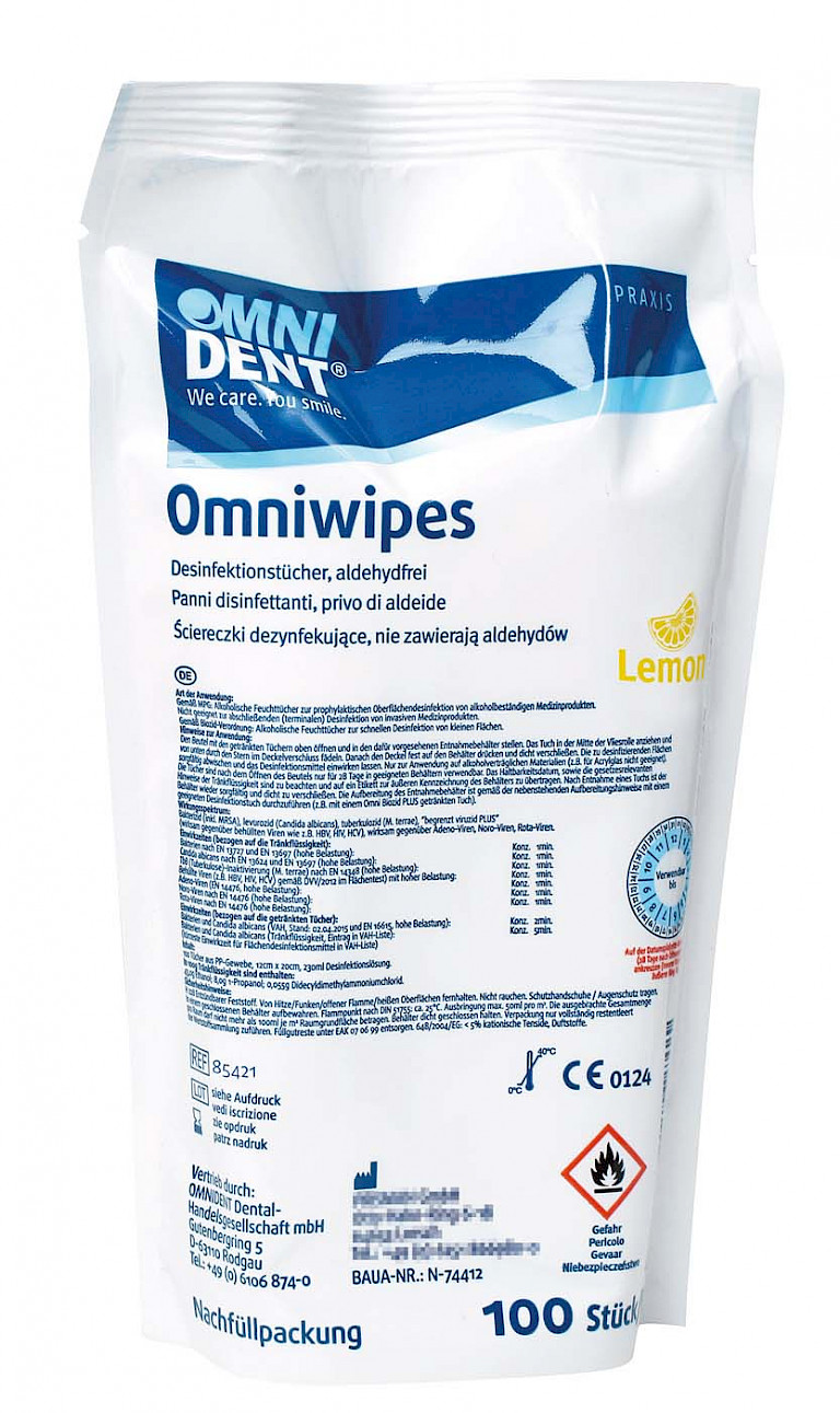 Alkoholische Feuchttücher zur prophylaktischen Oberflächendesinfektion von alkoholbeständigen Medizinprodukten sowie zur schnellen Desinfektion von kleinen Flächen, insbesondere Hand- und Winkelstücken, Behandlungseinheiten und Arbeitstischen in Zahnarztpraxen. Aldehydfrei. Flüssigkeit ist VAH-gelistet. 100 Tücher, Format 12 x 20cm. Wirkungsspektrum (Tränkflüssigkeit): Bakterien und Candida albicans nach EN13727, EN 13624 und EN 13697 (hohe Belastung) TbB (Tuberkulose)-Inaktivierung (M.terrae) nach EN 14348 (hohe Belastung), wirksam gegenüber behüllten Viren (z. B. HBV/HIV/HCV) gemäß DVV/2012. Einwirkzeiten nach Standardmethoden der VAH: Konz.: 1 Minute*; Adeno-, Rota-, Noro-Viren nach EN14476 (hohe Belastung) 1 Minute*, begrenzt viruzid Plus. Einwirkzeiten (bezogen auf die getränkten Tücher) Bakterien und Candida albicans (VAH, und EN 16615, hohe Belastung): 2 Minuten