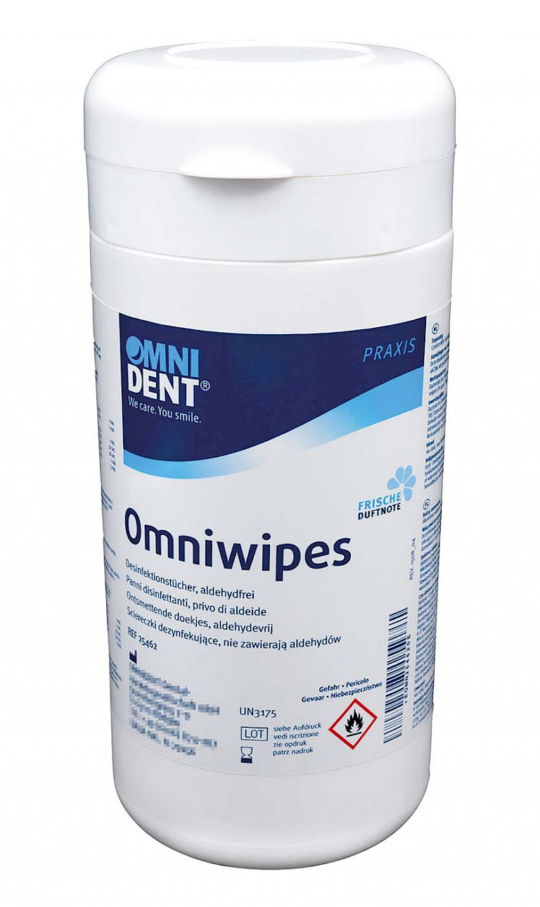 Alkoholische Feuchttücher zur prophylaktischen Oberflächendesinfektion von alkoholbeständigen Medizinprodukten sowie zur schnellen Desinfektion von kleinen Flächen, insbesondere Hand- und Winkelstücken, Behandlungseinheiten und Arbeitstischen in Zahnarztpraxen. Aldehydfrei. Flüssigkeit ist VAH-gelistet. 100 Tücher, Format 12 x 20cm. Wirkungsspektrum (Tränkflüssigkeit): Bakterien und Candida albicans nach EN13727, EN 13624 und EN 13697 (hohe Belastung) TbB (Tuberkulose)-Inaktivierung (M.terrae) nach EN 14348 (hohe Belastung), wirksam gegenüber behüllten Viren (z. B. HBV/HIV/HCV) gemäß DVV/2012. Einwirkzeiten nach Standardmethoden der VAH: Konz.: 1 Minute*; Adeno-, Rota-, Noro-Viren nach EN14476 (hohe Belastung) 1 Minute*, begrenzt viruzid Plus. Einwirkzeiten (bezogen auf die getränkten Tücher) Bakterien und Candida albicans (VAH, und EN 16615, hohe Belastung): 2 Minuten
