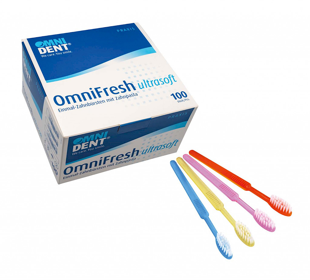 Karton 100 Zahnbürsten sortiert (blau, orange, pink, gelb)