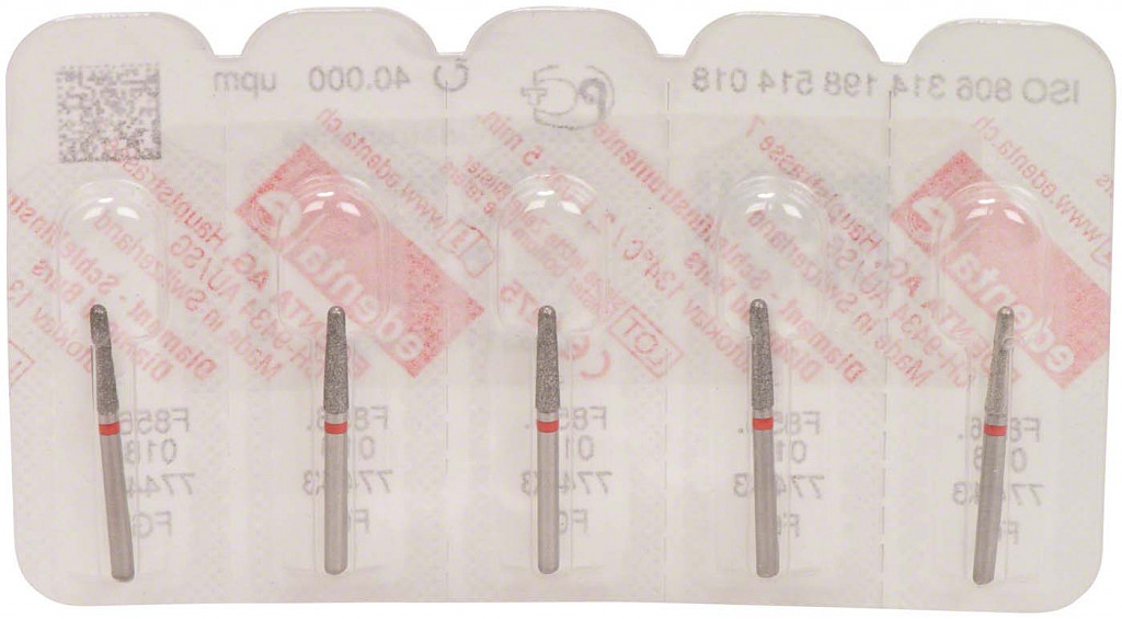 Packung 5 Diamanten rot fein, FG, Figur 198 Konus rund, Kopflänge: 8 mm, ISO 018