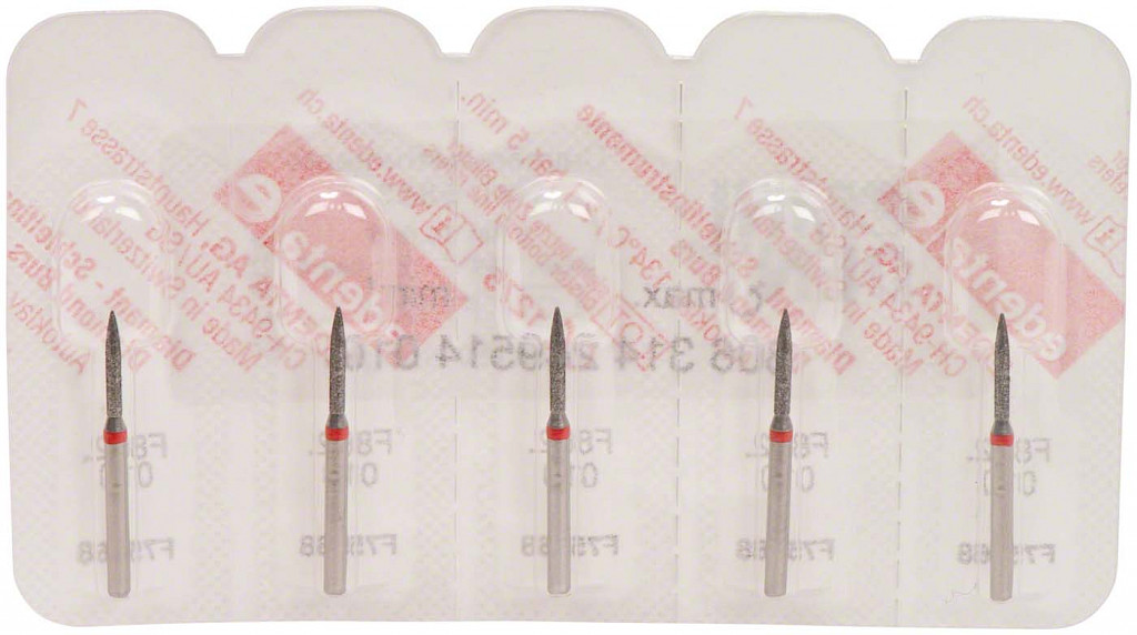 Packung 5 Diamanten rot fein, FG, Figur 249 Flamme, Kopflänge: 8 mm, ISO 010