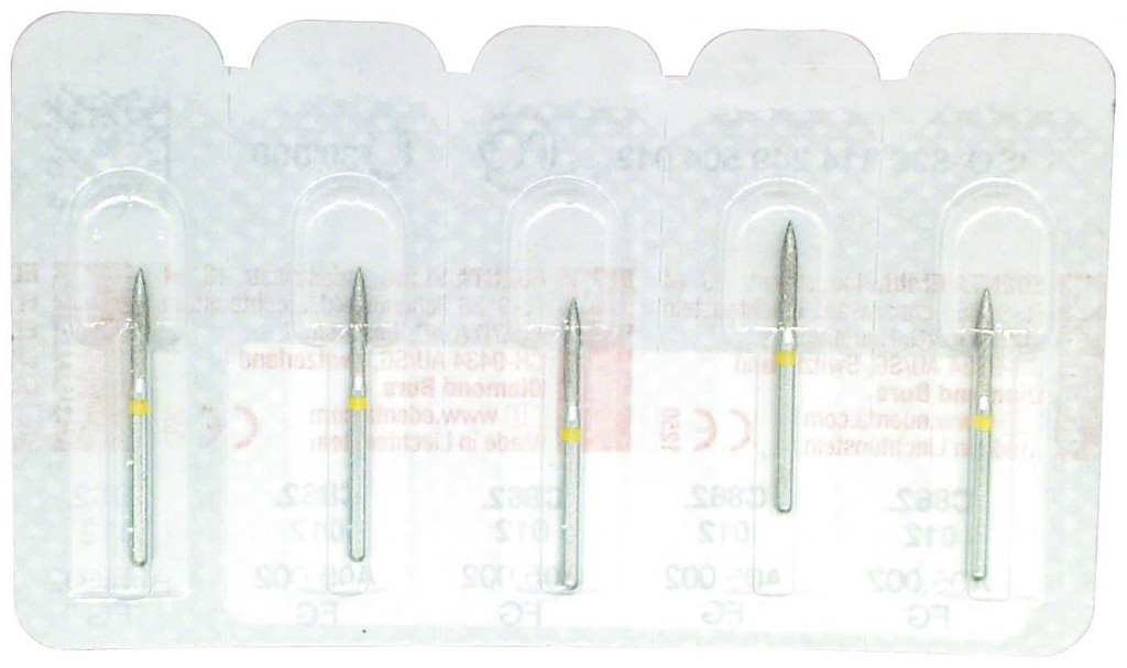 Packung 5 Diamanten gelb superfein, FG, Figur 249 Flamme, Kopflänge: 8 mm, ISO 012
