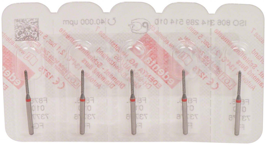 Packung 5 Diamanten rot fein, FG, Figur 289 Torpedo zylindrisch, Kopflänge: 8 mm, ISO 010