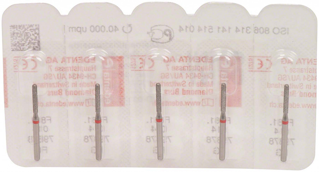Packung 5 Diamanten rot fein, FG, Figur 141 Zylinder rund, Kopflänge: 8 mm, ISO 014