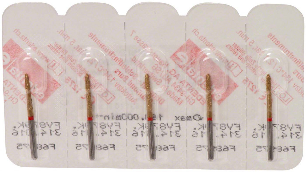 Packung 5 Schleifer rot fein, FG, Figur 299 Torpedo konisch, Kopflänge: 10 mm, ISO 016