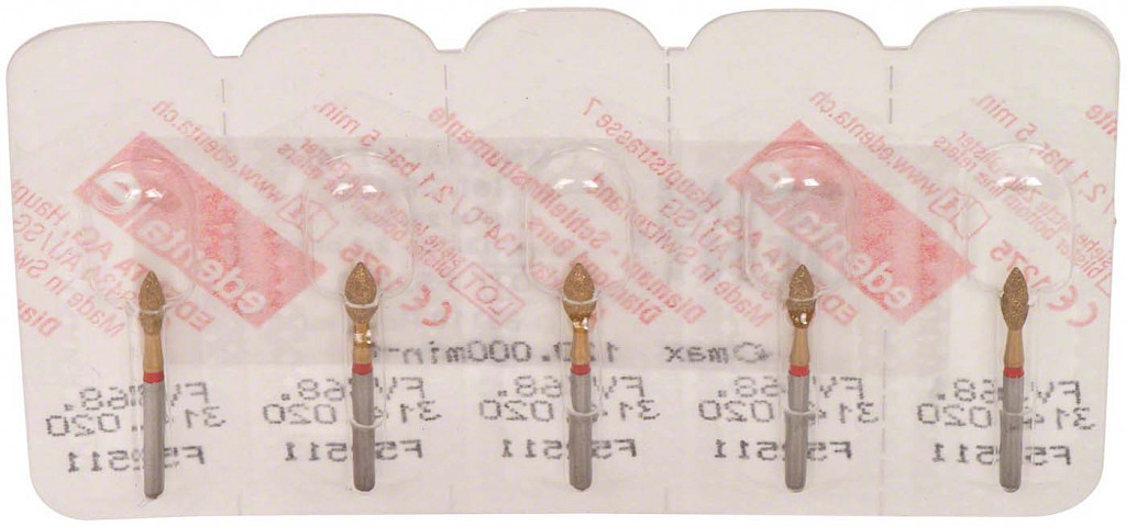 Packung 5 Schleifer rot fein, FG, Figur 257 Knospe, Kopflänge: 5,5 mm, ISO 020